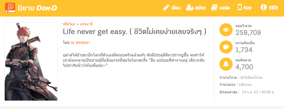 “ผมจำได้ว่านิยายเรื่องแรกนั้นมั่วมาก แต่ก็เต็มไปด้วยแรงบันดาลใจ จบแบบตัดเลยครับ ผมรู้สึกว่าไปต่อไม่ได้แล้วผมรู้สึกหมด passion กับเรื่องนี้ ก็เลยตัดจบไปเลย ตอนนั้นผมก็บอกนักอ่านตลอดนะว่าผมเป็นมือใหม่ ถ้าเกิดอะไรขึ้นก็ไม่ต้องแปลกใจ ก็เลยได้เรื่องแรกที่ค่อนข้างโอเคครับ”