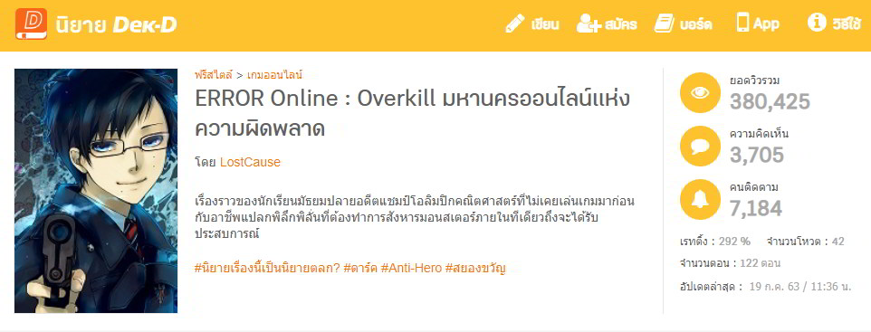นิยายเรื่อง ERROR Online : Overkill มหานครออนไลน์แห่งความผิดพลาด เป็นเรื่องที่มีจุดเริ่มต้นค่อนข้างแปลกเล็กน้อยครับ คือในตอนนั้นเป็นช่วงที่ผมกำลังมองหาพล็อตใหม่ๆ และก็ถูกเพื่อนยุให้แต่งนิยายเรื่องที่ ‘ทำให้คนอ่านสิ้นหวัง’ เลยทำให้ออกมาเป็นเรื่องที่ดาร์คยิ่งกว่าฮีโร่ของดีซีซะอีก (ฮา) เรื่องย่อๆ ก็คงจะเป็นเกมเมอร์วุ่นวายกับนายเอลีทเย็นชา...เอ่อ ย่อเกินไปสินะครับ ก็ประมาณว่าเป็นเรื่องราวของนักเรียนสายวิชาการที่ไม่เคยเล่นเกมมาก่อน กับชีวิตที่ผกผันจนทำให้เขาตัดสินใจที่จะมาเล่นเกมเป็นครั้งแรกครับ