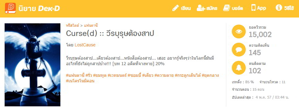 การเขียนนิยายเป็นงานอดิเรกที่เคยเป็นความฝันครับ ความฝันในเรื่องนิยายก็ยังคงมีอยู่เพียงแต่มันคงไม่ได้เป็นสิ่งที่สวยงามเหมือนในสมัยก่อนอีกแล้ว แต่แน่นอนว่าผมเองก็ไม่ได้ยอมแพ้นะครับ การกลับมาเขียนนิยายต่อในครั้งนี้ ในตอนแรกก็เพียงแค่ต้องการจะสานต่อให้มันจบ แต่พอเขียนไปเรื่อยๆ ก็ต้องบอกว่าผลตอบรับไม่ได้แย่อย่างที่คิดละมั้งครับ ฮะๆ