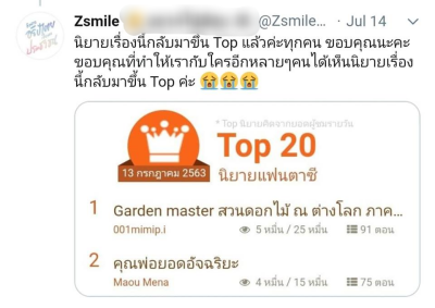 พอเห็นนิยายกลับมาติดท็อปรู้สึกดีใจค่ะ ดีใจมากกกกก อย่างที่บอกว่าเราเพิ่งมาอ่านนิยายเรื่องนี้ครั้งแรกเมื่อ 7 เดือนก่อน เห็นมีคนเคยโพสต์ในเพจเฟซบุ๊กของผู้แต่งว่าเรื่องนี้ขึ้นท็อปอีกแล้ว ติดท็อปตลอดเลย บลา ๆ ๆ คนมาทีหลังอย่างเราก็ได้แต่จินตนาการเอา ไม่คิดเลยว่าจะมีโอกาสได้เห็นกับตาตัวเองจริง ๆ ค่ะ ดีใจแทนนักอ่านทุกคนจริง ๆ
