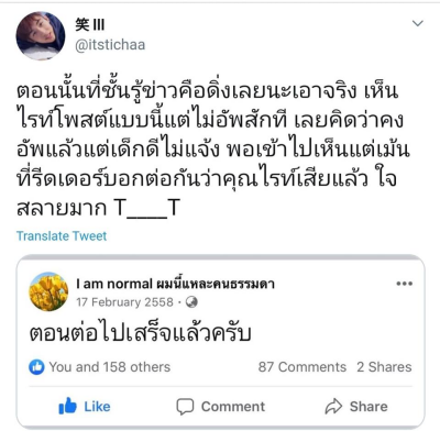 ทวิตเตอร์ @itstichaa โห จำได้ว่าเจอเรื่องนี้ประมาณปลายปี 2556 ช่วงแรกๆ ยังไม่สมูทเท่านี้เลยค่ะ 555 แต่คุณไรท์เขาเก็บไปพัฒนาตลอด สนุกขึ้นทุกตอนจริงๆ เราที่ติดตามอ่านก็เหมือนโตมาด้วยกันเลย พอเห็นนิยายกลับมาติดท็อปอีกครั้ง รู้สึกดีใจแล้วก็ตกใจมากกก555 นิยายที่ไม่ได้อัปมานานมากมันยากที่จะกลับมาติดท็อปใช่มั้ยล่ะคะ เห็นหน้านิยายคึกคักแล้วเหมือนได้ย้อนเวลากลับไปเลยอะเนอะ