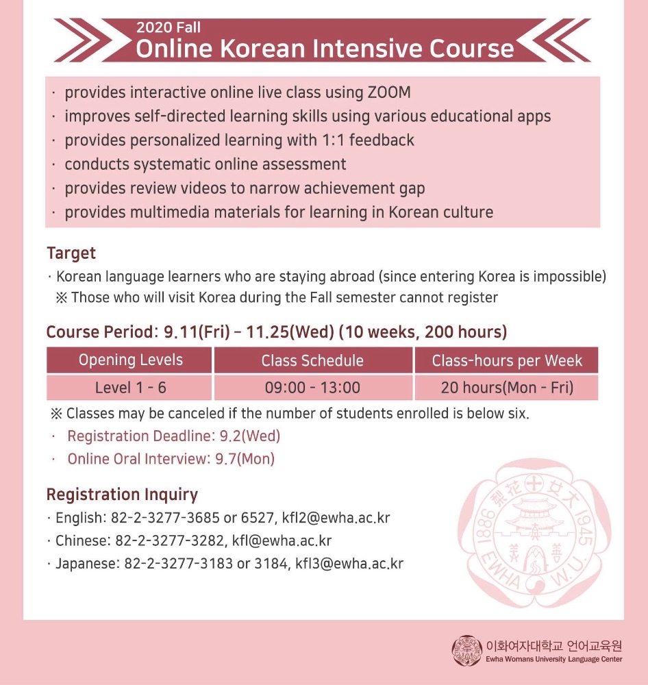 หลักสูตรที่จะเปิดสอนจะเป็นแบบ Intensive หรือหลักสูตรเข้มข้น มีให้เลือกเรียนไล่ระดับตั้งแต่เลเวล 1 - 6 เลยครับ (แต่ถ้าเลเวลไหนมีคนเรียนไม่ถึง 6 คนก็อาจจะไม่เปิดสอน) ซึ่งคอร์สนี้จะมีการเรียนสอนทุกวันจันทร์ถึงศุกร์ ตั้งแต่เวลา 09:10 – 13:00 น. (เรียนตามเวลาเกาหลี ซึ่งจะเร็วกว่าไทย 2 ชั่วโมง) เรียนวันละ 4 ชั่วโมง ทั้งหมด 10 อาทิตย์ (ประมาณ 2 เดือนกว่า) รวมเป็นเวลา 200 ชั่วโมง และหลังเรียนจบน้องๆ จะได้ใบประกาศนียบัตรจากม.สตรีอีฮวาด้วย