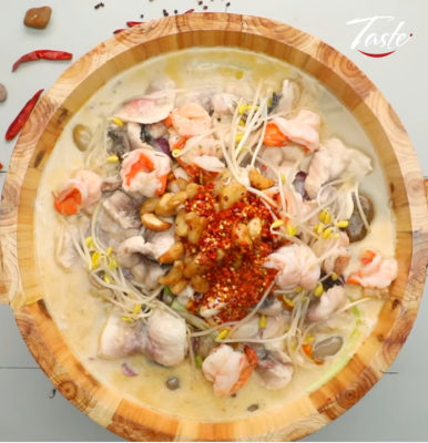 ทีเด็ดต่อมาคือการจัดจากที่เป็นเอกลักษณ์ไม่เหมือนใครค่ะ "เลี่ยงหลิน" ใช้กรวดมนเม็ดสวยๆ มาขัดล้างแล้วนำลงไปใส่ในกระทะที่ยังไม่ร้อนจัด ก่อนจะเอาหินร้อนที่สะเด็ดน้ำมันแล้ว จัดลงในถังไม้วางเรียงผักต่างๆ ลงไป หอมแดง ต้นหอม ถั่วงอก เนื้อปลาชิ้นบางที่แล่ไว้ หลังจากนั้นก็เทน้ำแกงปลาตามลงไป เมื่อของเหลวกระทบหินร้อนจัด จะเกิดเสียงดังฟู่ เดือดพล่านเป็นฟองฟอดในถังไม้ ควันสีขาวม้วนตัวขึ้นสูงเกิดกลิ่นหอมเครื่องเทศสมุนไพรที่ยังไม่ทันได้ลองกินก็สัมผัสได้แล้วว่าต้องอร่อยแน่ๆ กลิ่นลอยตามลมมาเลยค่ะ