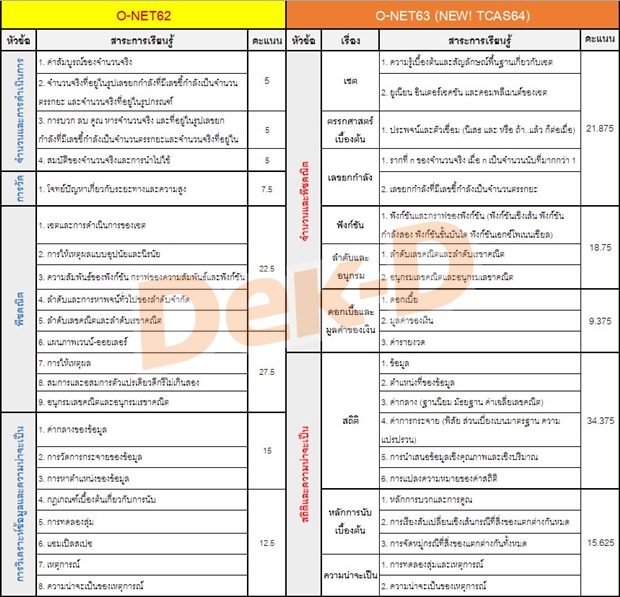 เมื่อเทียบสัดส่วนสาระที่ออกข้อสอบแล้ว พบว่า O-NET63 สำหรับน้อง #dek64 นั้น ข้อสอบ ได้ปรับสัดส่วนให้เป็นเรื่อง "จำนวนและพีชคณิต" 50 คะแนน และเรื่อง "สถิติและความน่าจะเป็น" อีก 50 คะแนน เรียกว่าออกอย่างละครึ่งเลยทีเดียว เทียบกับปี 62 ที่ข้อสอบจะเน้นไปเรื่องพีชคณิตถึง 50 คะแนน ในขณะที่ สถิติและความน่าจะเป็น ออกเพียง 27.5 คะแนน เท่านั้น ดังนั้นน้องๆ อย่าลืมไปปรับหัวเรื่องในการอ่านด้วยนะคะ ดูแนวข้อสอบผิดปี อาจทำคะแนนหายไปเยอะเลยค่ะ