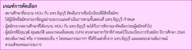 สวัสดีค่ะน้องๆ เชื่อว่าตอนนี้หลายคนก็กำลังรอระเบียบการการรับสมัคร TCAS64 ของหลายๆ มหาวิทยาลัยกันอยู่ ซึ่งนอกจากการรับในระบบ TCAS แล้ว บางมหาวิทยาลัยยังมีการเปิดรับสมัครรับตรงที่ไม่เข้า TCAS ด้วย อย่างเข่น "มหาวิทยาลัยเทคโนโลยีราชมงคลธัญบุรี" ที่เปิดรับ "โควตา MOU" ร่วมกับสถานศึกษาในเครือข่ายกว่า 336 แห่ง (เช็กรายชื่อ : คลิก) โดยเปิดรับน้องๆ ม.6 ในสาขาวิชาดังต่อไปนี้