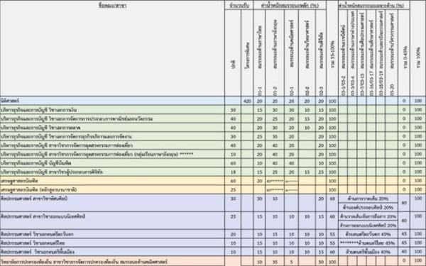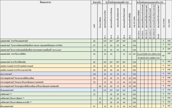 - สาขาวิชาแพทยศาสตร์ - แต่ละสมรรถนะต้องไม่น้อยกว่า 30% และคะแนนรวมทุกสมรรถนะ ต้องไม่น้อยกว่า 50%