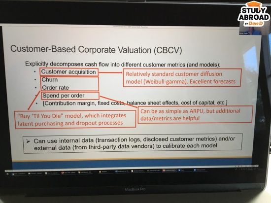 "แล้วก็จะมีวิชา Wharton 101 ที่ช่วยให้รู้จักแต่ละฟิลด์ของ Business มากขึ้น วิชานี้จะได้ทำโปรเจกต์กลุ่มร่วมกับเพื่อนๆ เช่น ทำ Market Research เพื่อให้คำปรึกษาโปรเจกต์ให้ American Cancer Society ทำยังไงถึงดึงดูดผู้หญิงมาเป็น Brand Ambassador เพื่อดึงดูดคนมาบริจาคมากขึ้น"
