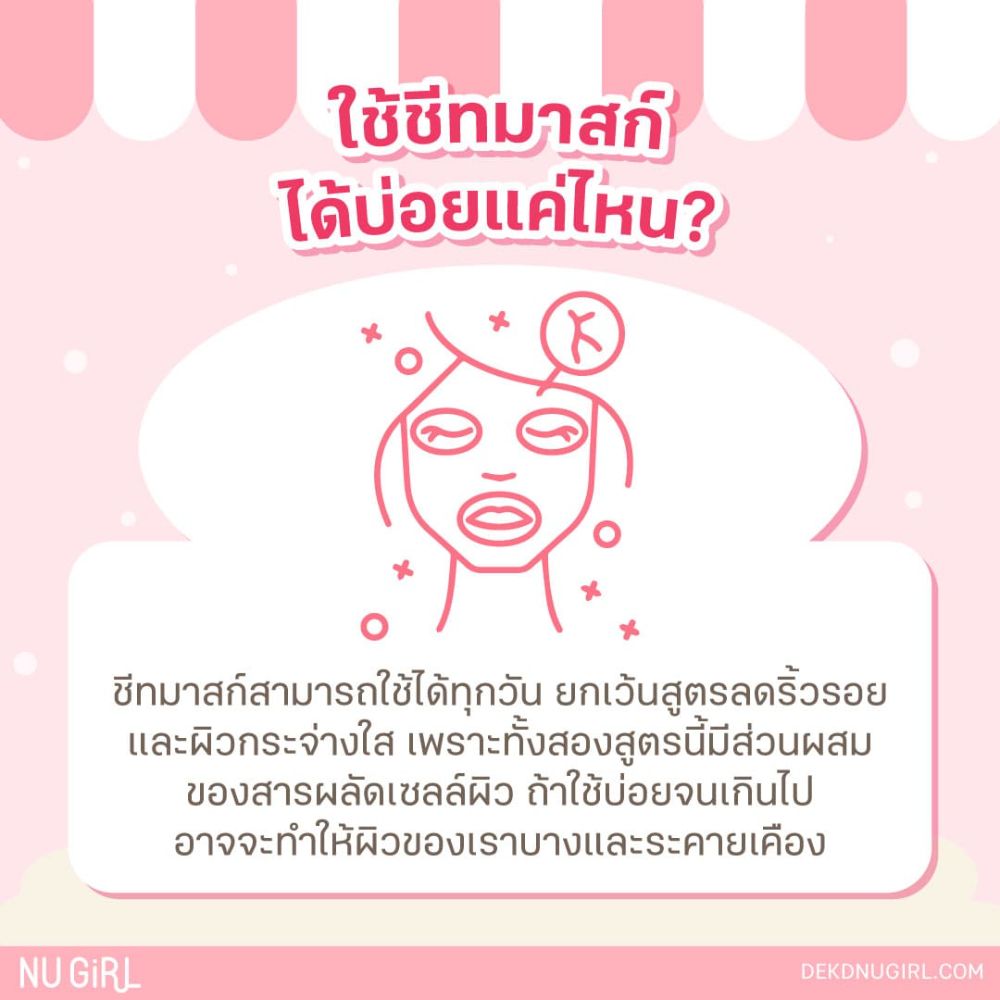 จริงๆ แล้วชีทมาสก์ถูกออกแบบมาเป็นสกินแคร์ที่เราสามารถใช้ได้ทุกวันค่ะ แต่ๆๆ ไม่แนะนำให้ใช้สูตรเดิมๆ ซ้ำกันทุกวัน โดยเฉพาะสูตรต่อต้านริ้วรอยและผิวกระจ่างใส เพราะทั้งสองสูตรนี้มีส่วนผสมของสารผลัดเซลล์ผิว ถ้าใช้บ่อยจนเกินไป อาจจะทำให้ผิวของเราบางและระคายเคืองได้ง่ายค่ะ