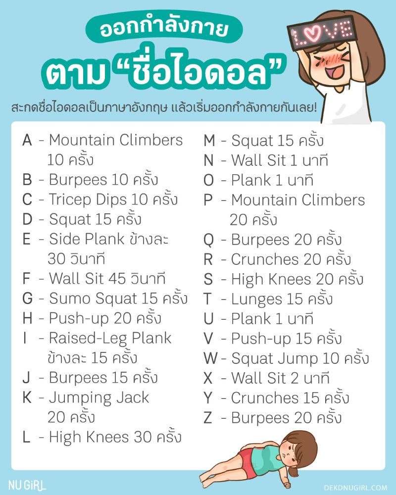 เท่านี้ก็จะได้ตารางออกกำลังกายเป็นของตัวเองในแต่ละวันแล้วค่ะ แนะนำว่าใครอยากหาแพชชั่นให้ตัวเองเยอะๆ ก็ลองลิสต์ชื่อไอดอลที่ชอบ แล้วเปลี่ยนชื่อทำวนไปก็สนุกดีนะคะ