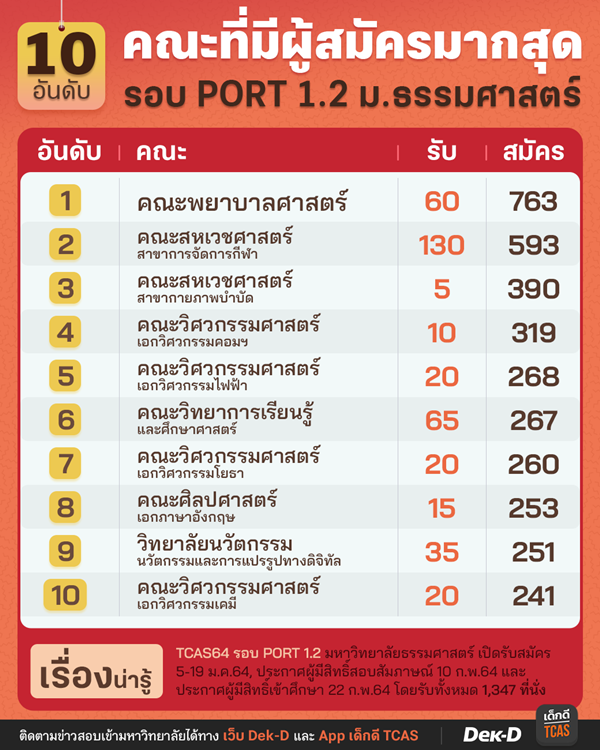 สวัสดีค่ะ ใครสมัครรอบ Portfolio ม.ธรรมศาสตร์ ไว้ ห้ามพลาดบทความนี้เลยค่ะ หลังจากที่พี่มิ้นท์ได้รวบรวมสถิติสาขายอดฮิตของ มศว ไปแล้ว ก็เห็นว่า ม.ธรรมศาสตร์ มียอดผู้สมัครออกมาเหมือนกัน ทั้งยอดผู้สมัครและสาขาที่ติด 10 อันดับนั้นน่าสนใจทีเดียวค่ะ จะมีอะไรบ้าง ไปดูกันเลยค่ะ