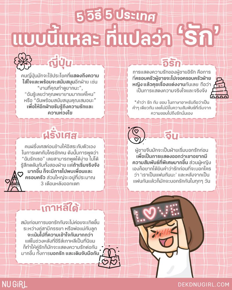 แน่นอนว่า ไม่ว่าเราจะเป็นคนประเทศไหน การที่เรามีความรักก็ถือเป็นเรื่องปกติค่ะ แต่รู้มั้ยว่า การบอกรักของคนในแต่ละประเทศ ก็มีความหมายที่ต่างกันไปตามวัฒนธรรมของประเทศนั้นๆ ด้วย อย่างคนไทยเอง จะใช้คำว่า รัก ก็ต่อเมื่อเรารู้สึกว่ารัก ไม่ได้มีอะไรซับซ้อน แต่ประเทศอื่นๆ ล่ะ เค้าจะสื่อความหมายยังไงกันบ้าง
