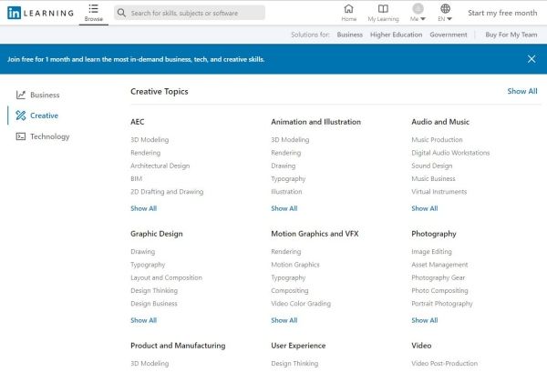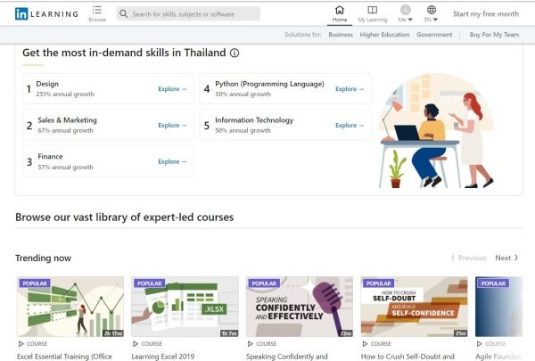 - ค้นหาและเลือกคอร์สที่สนใจจากด้านล่างนี้ หรือจาก https://www.linkedin.com/learning/me แล้วเริ่มเรียนได้เลย (*มีทั้งฟรีและไม่ฟรี โดนสมาชิกเดือนแรกสามารถทดลองเรียนได้ที่คำว่า start my free month)