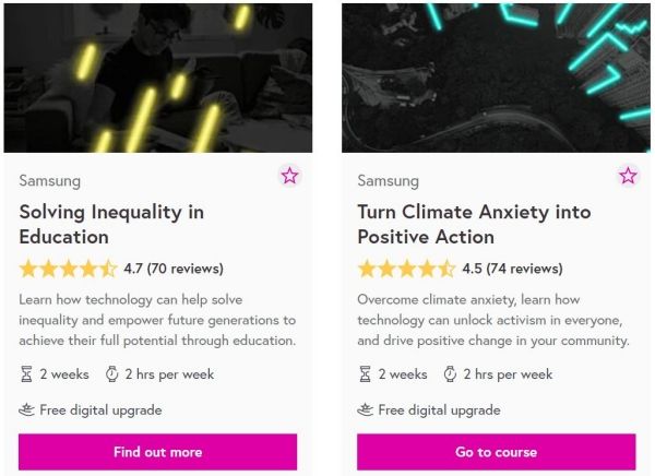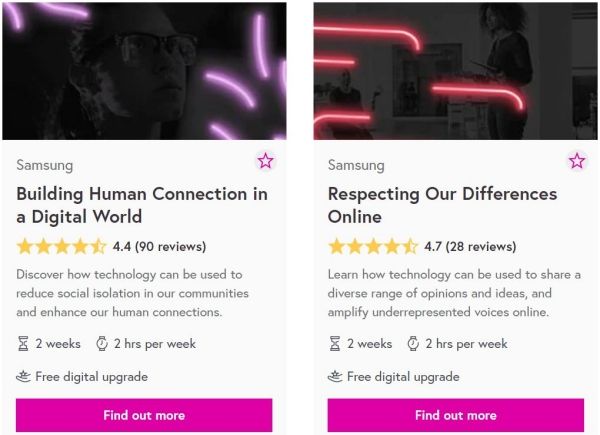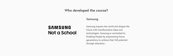 บริษัทยักษ์ใหญ่ก็ได้ร่วมมือกับแพลตฟอร์มเรียนออนไลน์ขนาดใหญ่อย่าง FutureLearn เปิดหลักสูตรชื่อว่า Samsung Not a School ให้เรียนได้ฟรีๆ ทางออนไลน์ถึง 4 คอร์ส และมีใบประกาศฯ มอบให้ด้วยค่ะ