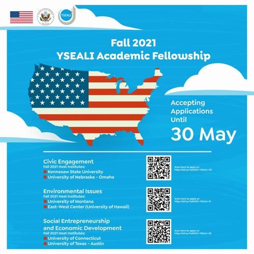 สถานทูตสหรัฐอเมริกา และ Young Southeast Asian Leaders Initiative (YSEALI) ประกาศรับสมัครเยาวชนไทยเข้าร่วมโครงการทุนแลกเปลี่ยน FALL 2021YSEALI ACADEMIC FELLOWSHIP โดยเยาวชนไทยผู้สนใจที่มีอายุระหว่าง 18-25 ปี สามารถเลือกสมัครในหัวข้อต่างๆ ได้ดังต่อไปนี้