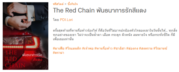 ส่วนผลงานก็ The Red Chain พันธนาการรักสีแดง เรื่องใหม่ล่าสุดของพีดีไอ เป็นเรื่องยาวเรื่องแรกที่หวนกลับมาเขียนหลังจากร้างลาไปนาน อาจจะขลุกขลักบ้างไรบ้าง อย่าถือสา (ฮ่า) เป็นเรื่องที่สนุกมากอีกเรื่อง เหมือนตัวเองเป็นผู้กำกับซีรี่ส์ที่มีพลิกไปมาให้ลุ้นตลอด พระนางรักกันตั้งแต่ต้นเรื่องเลย สะดวกดี (ฮ่า) พระเอกคนนี้ถือว่าเขียนได้ลึกสุดแล้วจริงๆ ถ้าเป็นสีคือดำสนิทของแท้ ใครที่ชอบอ่านเรื่องหนักๆ ลุ้นๆ และสายคลั่งรักระดับปีศาจ ลองเชิญอ่านได้ อ้อ มีตอนแถมพิเศษให้อ่านฟรีกันด้วย เบาๆ ชวนผ่อนคลาย