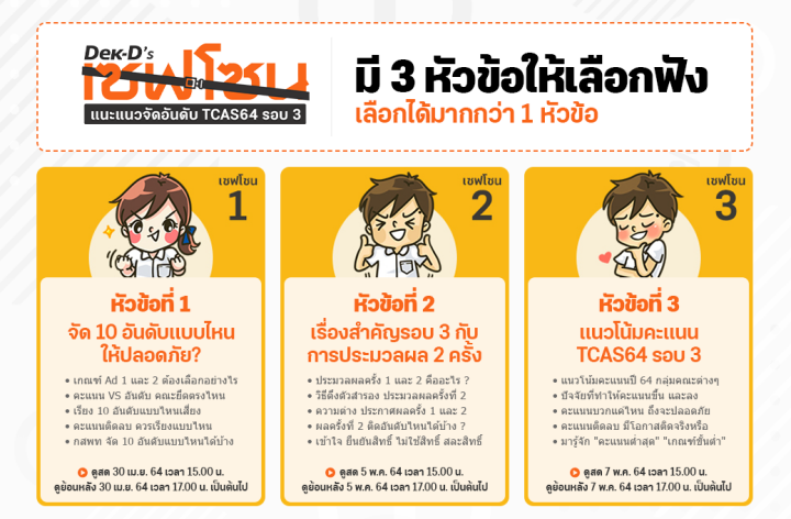 สุดท้ายนี้ มีกิจกรรมตัวช่วยน้องๆ #dek64 มาฝาก ก่อนวันเลือกคณะนี้ เว็บเด็กดี จะมีจัดกิจกรรมสรุปเรื่องสำคัญแนะนำการเลือกคณะและจัดอันดับ ชวนน้องๆ ที่สนใจมาฟังข้อมูลและการวิเคราะห์คะแนนแบบย่อยให้ครบ เพื่อเอาไปปรับใช้ใน 10 อันดับของตนเอง มี 3 หัวข้อให้เลือกฟังดังนี้ โดยมีค่าสมัครหัวข้อละ 40 บาท ดูสดถามตอบ และดูย้อนหลังได้ตลอดไม่จำกัด น้องๆ ที่สนใจสามารถกดสมัครได้ทาง www.dek-d.com/safezone