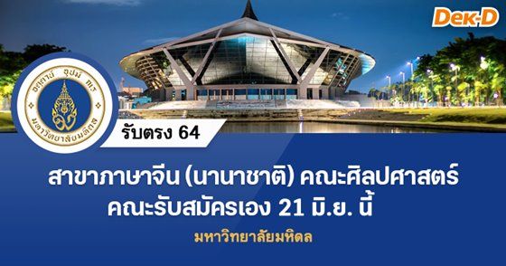 สวัสดีน้องๆ ชาว Dek-D ค่ะ รับตรงนี้เหมาะสำหรับน้องๆ สายศิลป์หรือผู้ที่สนใจด้านภาษา เพราะเป็นสาขาวิชาภาษาจีน (หลักสูตรนานาชาติ) คณะศิลปศาสตร์ ม.มหิดล ค่ะ