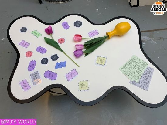 - ส่วนแรกคือ Presentation ตั้งก่อนว่าเราจะทำโปรเจกต์เรื่องอะไร แล้วเค้าจะไม่ให้หลุดโฟกัสเลย ต้องค่อยๆ ก่อร่างขึ้นมา พรีเซนต์ความคืบหน้าเป็นระยะ ทุกครั้งจะมี feedback session ให้เพื่อนเขียนคอมเมนต์ว่าคิดยังไงกับงานของเรา โดยไม่มีใครตัดสินอะไรทั้งสิ้น อาจารย์จะให้คำแนะนำแต่ไม่บอกว่า ‘ไม่ดี’ ‘ไม่ควรทำ’ (แต่เราก็แอบลังเลว่าสรุปแล้วงานเราดีจริงๆ มั้ยอะะ 5555)