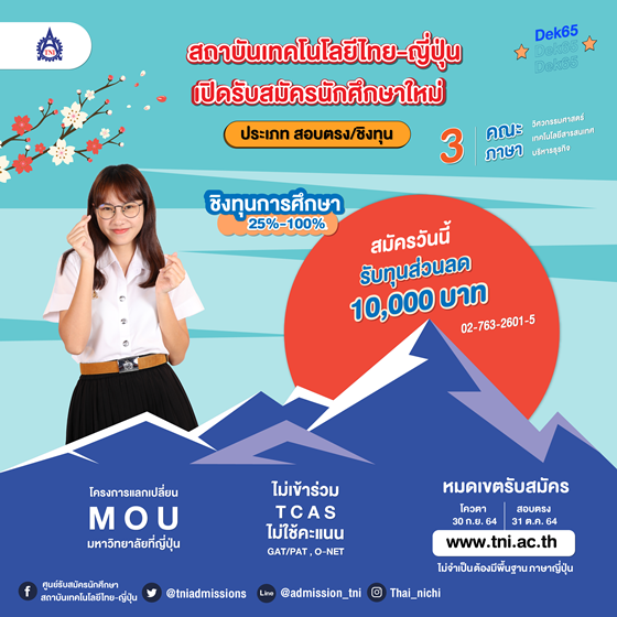 เปิดประเดิมรับตรงสำหรับ #dek65 จากโครงการรับตรง+ทุนและโควตา ของสถาบันเทคโนโลยีไทย-ญี่ปุ่น จุดเด่นของที่นี่ นอกจากจะมาไวเป็นที่แรกๆ ทุกปีแล้ว ยังไม่เข้าร่วม TCAS และยังมีทุนการศึกษา นอกจากนั้นยังมีการเรียนการสอนที่เสริมภาษาอังกฤษเข้ามาอีกด้วย เรียนทั้งทีได้ 3 ภาษาเลย