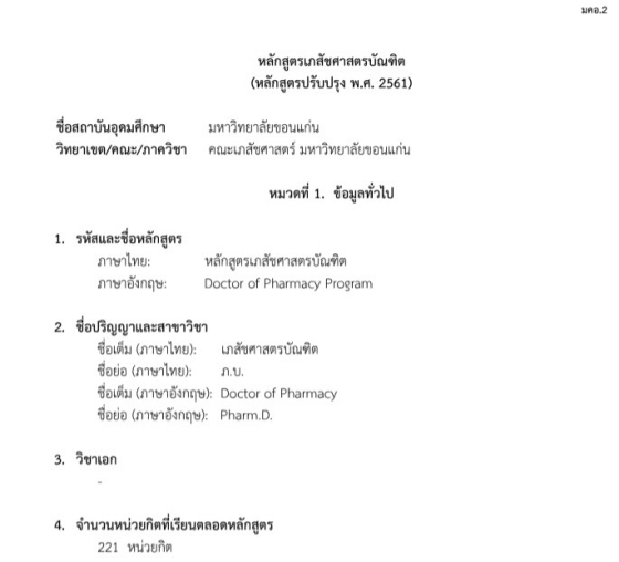 ตัวอย่าง มคอ.2 คณะเภสัชศาสตร์ มหาวิทยาลัยขอนแก่น
