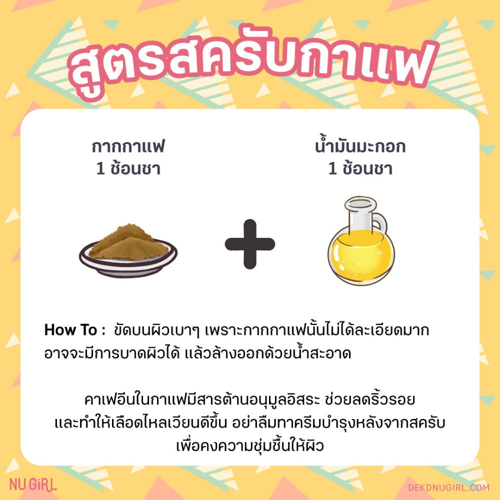 ใช้กากกาแฟ 1 ช้อนชา ผสมกับน้ำมันมะกอก 1 ช้อนชา เพื่อให้เนื้อสครับลื่น และขัดได้ง่าย ขัดบนผิวเบาๆ แล้วล้างออกด้วยน้ำสะอาด