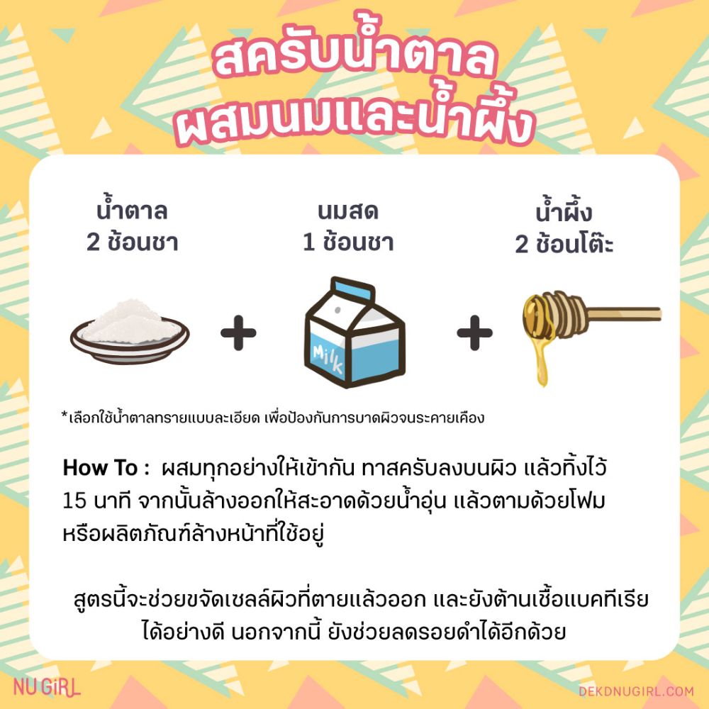 ผสมน้ำผึ้ง 2 ช้อนโต๊ะ นมสด 1 ช้อนชา และน้ำตาล 2 ช้อนชา ทาสครับลงบนผิว แล้วทิ้งไว้ 15 นาที จากนั้นล้างออกให้สะอาดด้วยน้ำอุ่น แล้วตามด้วยโฟมหรือผลิตภัณฑ์ล้างหน้าที่ใช้อยู่