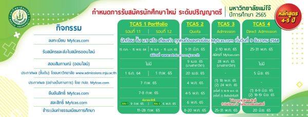 สำหรับความน่าสนใจของ ม.แม่โจ้ ปีนี้ จะเปิดรับทั้งหมด 4 รอบค่ะ แต่รอบ Portfolio จะแบ่งการรับเป็น 2 ช่วง เรียกว่ารอบ 1.1 และ 1.2 มีระยะเวลารับสมัครรอบละ 1 เดือนค่ะ นอกจากนี้ในรอบ 3 Admission และ รอบ 4 Direct Admission ไม่มีสัมภาษณ์ด้วย ไปดูกำหนดการแต่ละรอบพร้อมกันเลยค่ะ