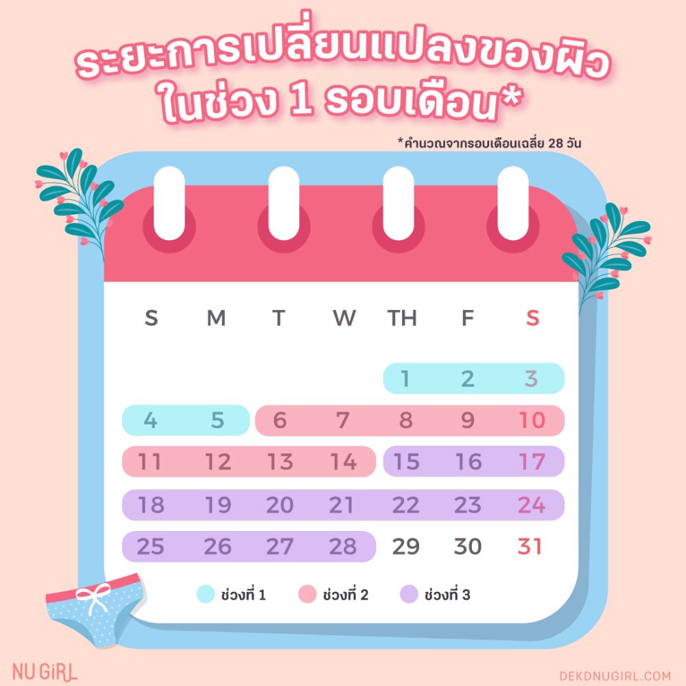 โดยปกติแล้วผู้หญิงเราจะมีรอบเดือนโดยเฉลี่ยประมาณ 28 วัน (นับจากวันแรกที่ประจำเดือนมา ไปจนถึงวันก่อนที่ประจำเดือนรอบใหม่จะเริ่มค่ะ) และจะมีประจำเดือนเฉลี่ยอยู่ที่ 5 วัน เราสามารถดูแลผิวในแต่ละช่วงได้ตามนี้เลยค่ะ