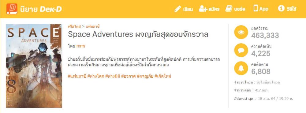 สำหรับนิยายเรื่อง Space Adventures เดิมทีผมจะเขียนนิยายแนวจีนต่อครับแต่เขียนไม่ออก เลยมาซ้อมมือกับแฟนตาซี เขียนไปเขียนมาก็สี่ร้อยตอนแล้ว และตั้งใจว่า 6-700 ตอนจะจบครับ แต่เรื่องนี้ก็คล้ายๆ เรื่องแรกที่เขียน แต่เรื่องแรกแรงบันดาลใจจากคำสอนศาสนา ส่วนเรื่องนี้แรงบันดาลใจจากวิทยาศาสตร์