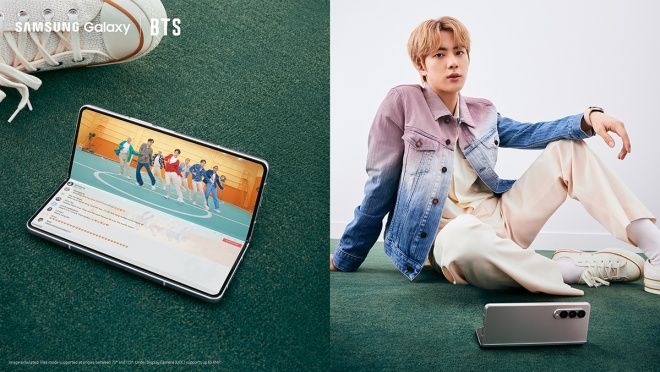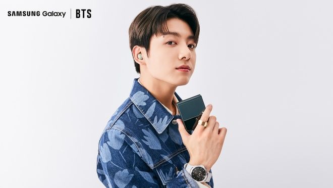 ส่วนวี (V) และจองกุก (Jungkook) มาพร้อมกับ Galaxy Z Flip3 5G สีเขียวที่สะท้อนเสน่ห์อันแปลกตา โดยเมื่อใส่เข้าคู่กับ Galaxy Buds2 สีเขียว Olive และ Galaxy Watch4 series สีดำหรือสีเงิน ก็อัพเลเวลความชิคขึ้นอีกหนึ่งขั้นทันที โดยสำหรับสายโซเชียลยิ่งควรมีสมาร์ทโฟนรุ่นนี้ เพราะสามารถวิดีโอคอลหาเพื่อนได้แบบชิลๆ โดยไม่ต้องใช้มือจับสมาร์ทโฟนไว้ตลอด หรือหาที่พิง ทีนี้แม้คุยนานแค่ไหนก็ไม่เป็นปัญหาอีกต่อไป