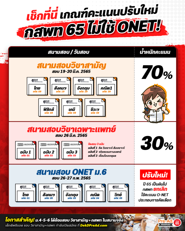 แต่เดิม กสพท จะกำหนดเกณฑ์ขั้นต่ำอยู่ 13 วิชา ประกอบไปด้วย วิชาสามัญ = 7 วิชา และ O-NET ม.6 = 5 วิชา แต่สำหรับเกณฑ์คะแนน กสพท ปี 65 มีการเปลี่ยนแปลงใหม่โดยจะไม่มีการนำคะแนน O-NET ม.6 มาใช้พิจารณา ส่งผลให้คะแนนขั้นต่ำของปี 65 จะมีกำหนดแค่ในวิชาสามัญ 7 วิชา แต่ละวิชากำหนดเกณฑ์คะแนนขั้นต่ำที่เท่าไหร่ ติดตามจากากภาพอินโฟกราฟิกด้านล่างกันครับ
