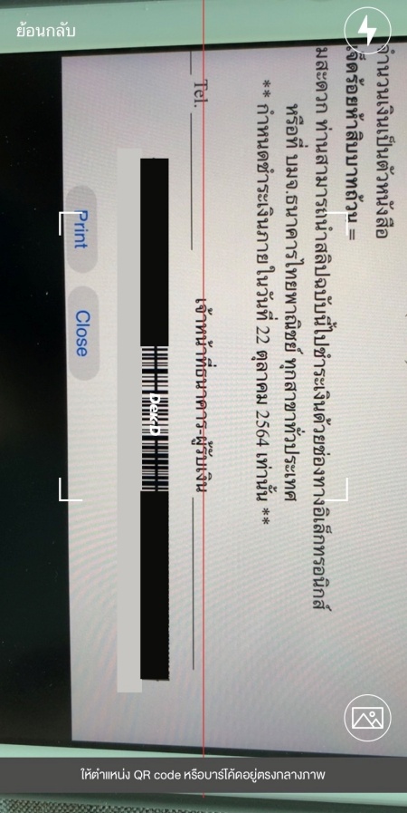 จากนั้นแสกนให้ เส้นสีแดง ทาบลงบนบาร์โคด อาจจะต้องหันโทรศัพท์มือถือให้เป็นแนวนอน