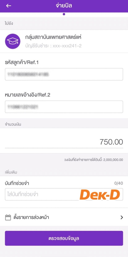 ให้น้องๆ เช็กหมายเลขอ้างอิง Ref.1 Ref.2 ใน App ให้ตรงกับ เอกสารกสพท02 ถ้าถูกต้องเรียบร้อยแล้ว ก็กดชำระเงินได้เลย และอย่าลืม!! เก็บสลิป หรือหลักฐานการชำระเงินเอาไว้ด้วย