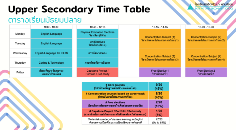 - Free electives (วิชาเลือกเสรีตามความสนใจหรือเสริมเป้าหมาย) 10% (2 คาบต่อสัปดาห์)