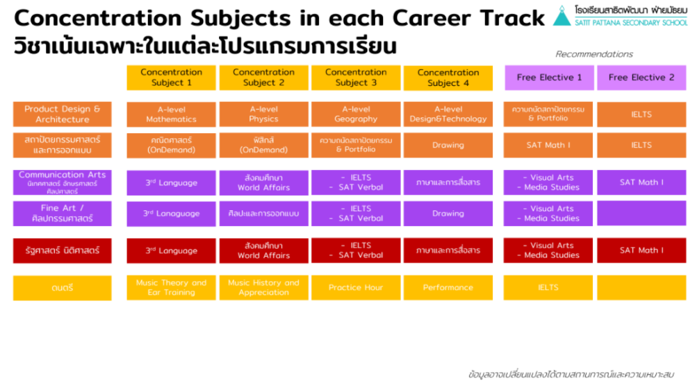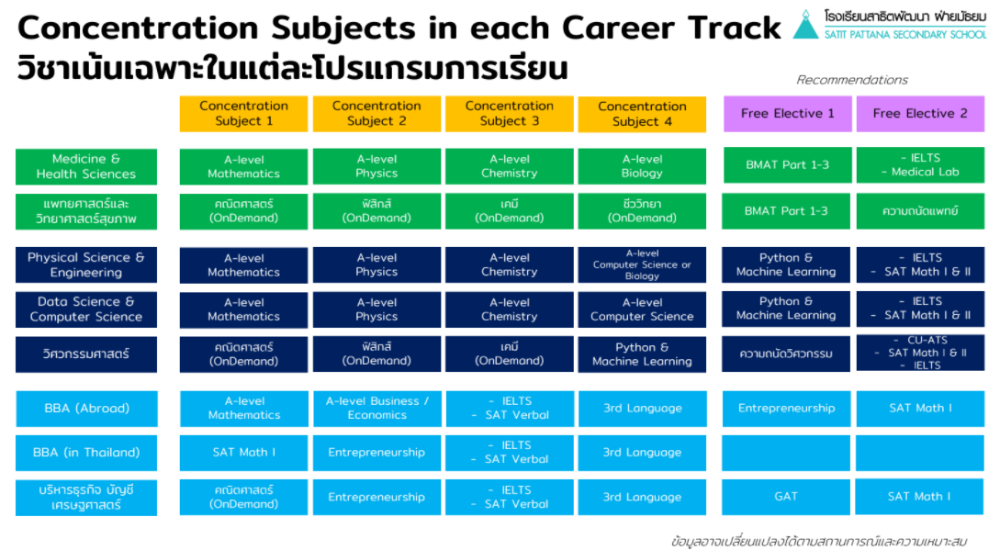 จากแผนการเรียนทั้ง 15 Track ก็จะมีครบทุกสาขาวิชาชีพ ไม่ว่าจะเป็นการแพทย์ วิทยาศาสตร์ วิศวกรรมศาสตร์ เทคโนโลยี ศิลปกรรม อักษรศาสตร์ พาณิชยศาสตร์ และยังมีให้เลือกทั้งกลุ่มภาษาไทยและสำหรับหลักสูตรอินเตอร์หรือการเรียนต่อต่างประเทศ เช่น กลุ่มแทรค Medicine & Health Science จะได้เรียนวิชาหลักเป็น A-Level แต่ถ้าแทรคแพทยศาสตร์และวิทยาศาสตร์สุขภาพก็จะได้เรียนเป็นวิชาคณิตศาสตร์ ฟิสิกส์ เคมี และชีววิทยา นั่นเอง