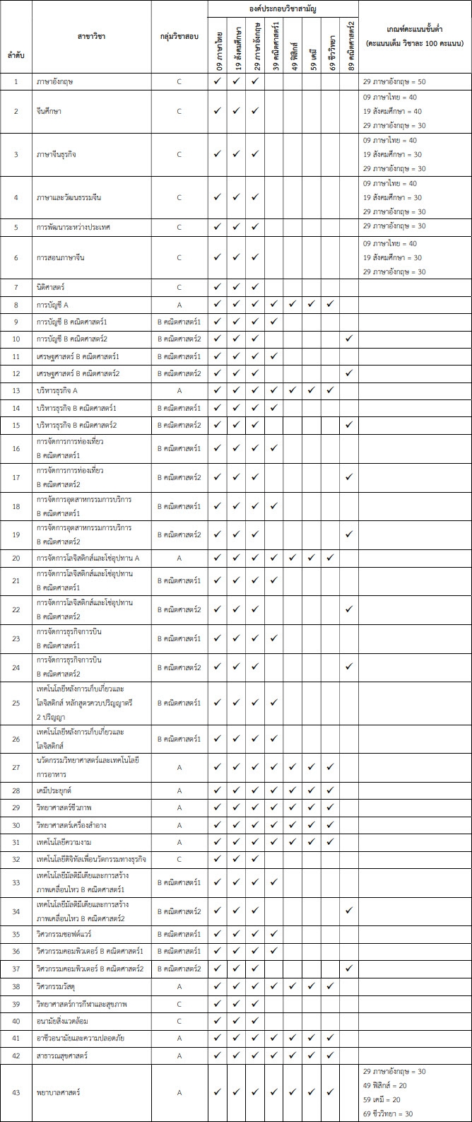 - กลุ่มวิชาสอบ C คือ ใช้คะแนนสอบภาษาไทย, สังคมศึกษา, ภาษาอังกฤษ รวม 300 คะแนน