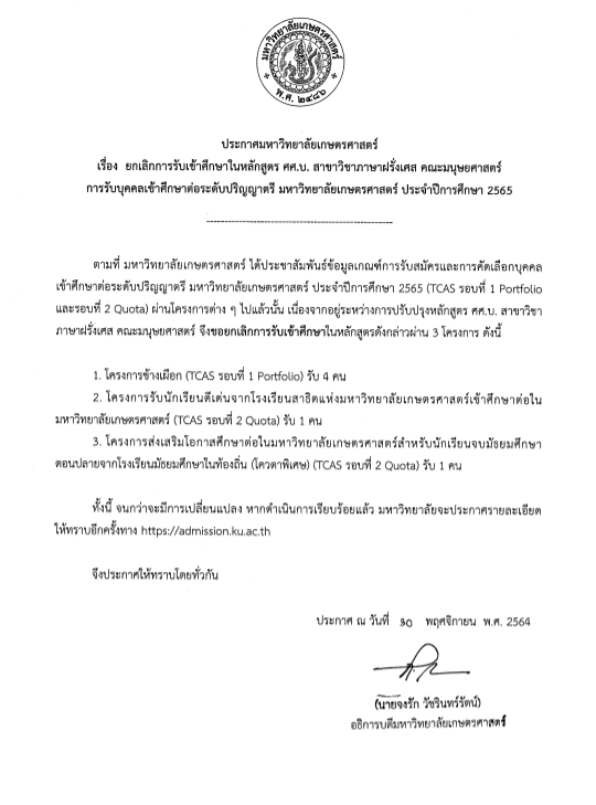 ล่าสุด มหาวิทยาลัยเกษตรศาสตร์ ได้ออกประกาศเปลี่ยนแปลงการรับสมัครในคณะมนุษยศาสตร์ สาขาวิชาภาษาฝรั่งเศส เนื่องจากหลักสูตรกำลังอยู่ระหว่างการปรับปรุงหลักสูตร โดยยกเลิกหลักสูตรนี้จาก 3 โครงการ คือ