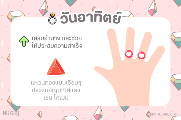 ใส่แหวนนิ้วไหนดี : แนะนำให้ใส่นิ้วนางหรือนิ้วกลาง จะช่วยเสริมความเป็นผู้นำให้มีอำนาจมากขึ้น และยังช่วยให้ประสบความสำเร็จในเรื่องต่างๆ อีกด้วย