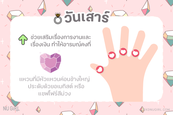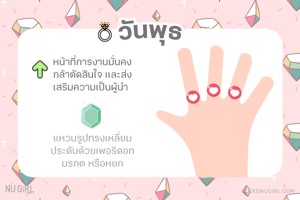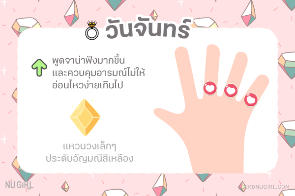 ใส่แหวนนิ้วไหนดี : แนะนำให้ใส่นิ้วกลาง นิ้วนางและนิ้วชี้ ช่วยส่งเสริมให้มีความก้าวหน้ามากขึ้น และทำให้ดูอ่อนโยน น่าเข้าหา