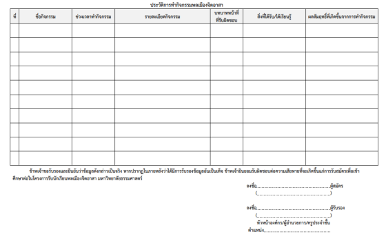 เป็นเงื่อนไขที่ท้าทายสำหรับน้องๆ ที่ทำกิจกรรมเยอะ เพราะต่อให้ทำจำนวนมากแค่ไหน น้องๆ จะต้องคัดมาไม่เกิน 3 กิจกรรมที่คิดว่าดีที่สุดและเกิดผลสัมฤทธิ์มากที่สุด ย้อนหลังได้ไม่เกิน 5 ปี โดยบรรยายลงในแบบฟอร์มประวัติการทำกิจกรรมพลเมืองจิตอาสา โดยจะต้องบรรยายทั้ง 3 กิจกรรม รวมกันไม่เกิน 2 หน้ากระดาษนะคะ จากนั้นให้ใส่รูปภาพประกอบลงในแบบฟอร์มที่กำหนดเช่นกัน นอกจากจะท้าทายเรื่องการคัดผลงานแล้ว ยังท้าทายในเรื่องของการสรุปความและนำเสนอตัวตนผ่านพื้นที่ที่จำกัดอีกด้วย
