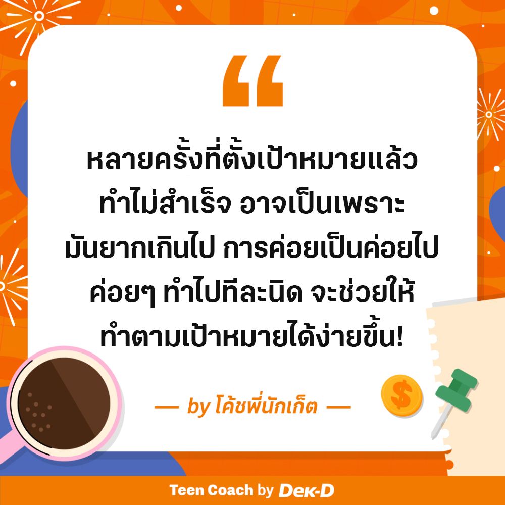 เพราะส่วนมากเราจะตั้งเป้าหมายที่ยากเกินไป หรือเป็นไปได้ยากเกินไป ซึ่งในบางครั้งจะทำให้ตัวเรารู้สึกผิดหวังในตัวเอง เมื่อเราไม่เป็นไปตามที่เราคาดหวัง เราจะกดดัน แล้วยิ่งส่งผลกระทบทางลบต่อร่างกายของเรา บางครั้ง การค่อยเป็นค่อยไป ขยับไปทีละสเต็ป ทีละนิด ก็จะช่วยให้เราทำตามเป้าหมายได้ง่ายขึ้น เมื่อเราทำตามเป้าหมายเล็กๆได้ เราก็จะมีแรงฮึดสู้ มีกำลังใจที่จะลองลงมือทำเป้าหมายที่ใหญ่ขึ้นได้นั่นเอง
