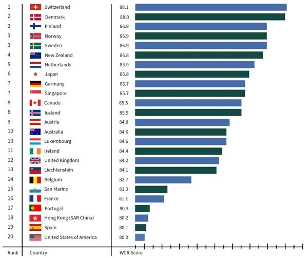 อีก 4 ประเทศลำดับถัดมาใน Top5 เป็นกลุ่มประเทศนอร์ดิก ได้แก่ เดนมาร์ก (88.0 คะแนน), ฟินแลนด์, นอร์เวย์ และสวีเดน ซึ่งได้คะแนนเฉลี่ยรวม 86.9 เท่ากัน