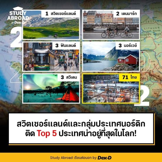 สวัสดีครับชาว Dek-D คราวก่อนพี่ปุณพาน้องๆ ไปดู Top10 เมืองน่าเรียนที่สุดในโลกมาแล้ว สำหรับวันนี้ พี่วุฒิ จะพาไปส่องอันดับ "ประเทศน่าอยู่ที่สุดในโลก ประจำปี 2022" กันบ้างครับ เผื่อเป็นประโยชน์สำหรับน้องๆ ที่กำลังตัดสินใจจะโยกย้ายไปเรียนต่อ ทำงาน หรือใช้ชีวิตในต่างแดน ไปดูกันว่ามีประเทศในฝันของเราติดโผบ้างมั้ยนะ?