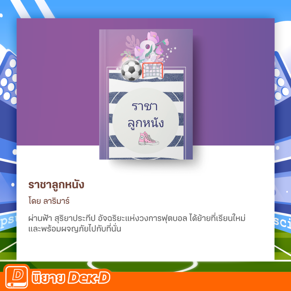 เรื่องนี้คือเกี่ยวกับฟุตบอลเต็มๆ และพระเอกเตะบอลเก่งมากกก คือเทพสุดๆ ตัวเนื้อเรื่องก็จะเล่าตั้งแต่เขาเริ่มหาคนเข้าทีม ฝึกซ้อมยังไง ไปจนถึงตอนลงแข่ง แต่ถ้าอ่านเรื่องนี้ดีๆนะคะ สิ่งที่นักเขียนอยากจะสื่อคือไม่มีใครประสบความสำเร็จเสมอไปค่ะ กว่าพระเอกจะมาถึงจุดนี้ เขาก็ฝ่าฟันอุปสรรค ขยันซ้อม จนเป็นแชมป์ได้ และยิ่งช่วงการแข่งขัน นักเขียนบรรยายได้สมจริงมาก พี่นะอ่านแล้วคือจินตนาการภาพออกตามได้เป็นฉากๆเลยค่ะ แถมภาษาที่ใช้เขียนในเรื่องก็ช่วยส่งให้เรื่องน่าอ่านสุดๆ ใครที่ชอบดูบอล หรือเป็นคอสายบอล ห้ามพลาดเลย อ่านแล้วต้องอินแน่นอน!