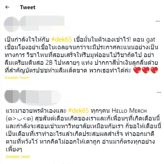 มีน้องๆ หลายคนคอยเข้าไปทวิตให้กำลังใจเพื่อนร่วมทางกันอย่างมากมายเลย มีทั้งคำคม คำอวยพร ประโยคที่อ่านแล้วทำให้ใจฟู พอพี่แป้งได้เข้าไปอ่านแล้วก็รู้สึกว่าเป็นเรื่องราวที่น่ารักมากๆ เพราะอีกหนึ่งสิ่งที่น้องๆ #dek65 ทุกคนต้องการในตอนนี้ก็คงจะเป็นกำลังใจที่ดี จากครอบครัว คนรอบข้าง หรือแม้กระทั่งมิตรภาพบนโลกออนไลน์