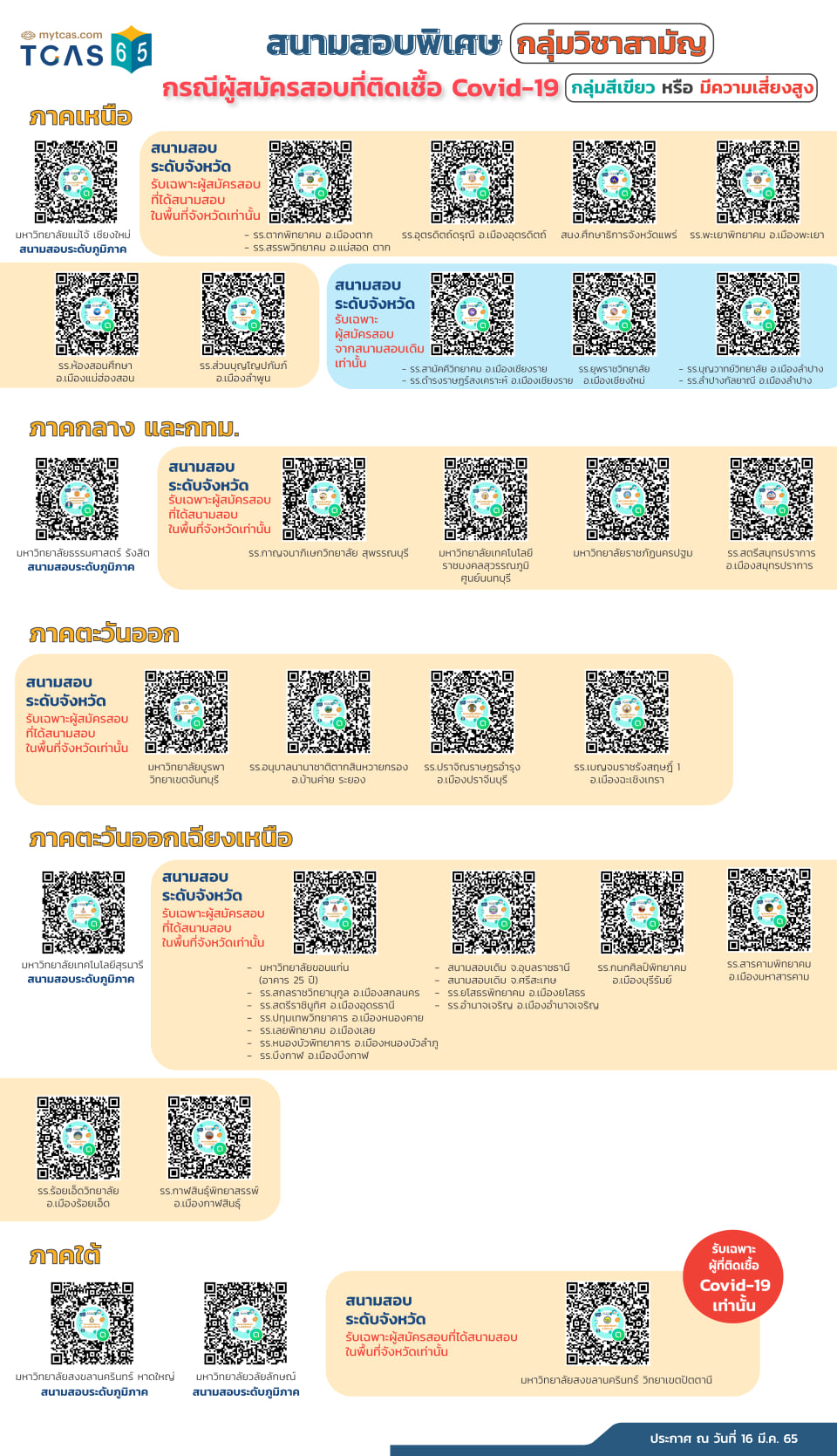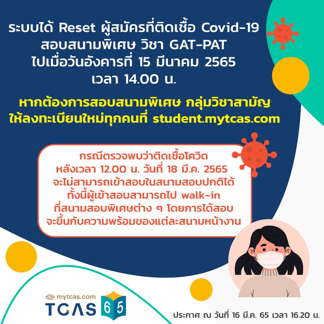 ส่วนใครที่ตรวจพบว่าติดเชื้อ หลังจากเวลา 12.00 น. ของวันศุกร์ที่ 18 มีนาคม 2565 จะไม่สามารถเข้าสอบในสนามสอบปกติได้ แต่สามารถ walk-in ไปที่สนามสอบพิเศษต่าง ๆ ได้ ทั้งนี้การได้เข้าสอบ จะขึ้นกับความพร้อมของแต่ละสนามหน้างาน