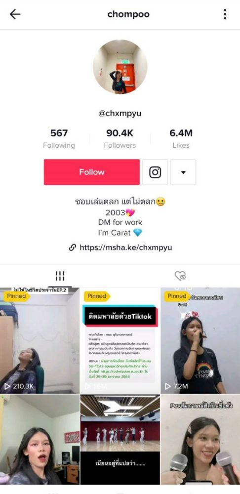 พี่ชมพู่เล่าว่า เริ่มเล่น TikTok ตั้งแต่กลางปี 2020 ตอนนั้นเล่นตามกระแสไปเฉยๆ เพราะอยู่ในช่วงโควิด แต่ก็ยังเล่นมาเรื่อยๆ จนได้เห็นโครงการรับสมัครนี้ ซึ่งคณะกำหนดมาว่า ถ้ามีผลงานการเป็น Blogger, Youtuber, KOL หรือ Influencer ก็ให้ใส่เข้ามาใน Portfolio ด้วย ซึ่งตนเองมองว่าทำตรงนี้อยู่แล้ว ก็เลยใส่ TikTok เข้าไปเป็นผลงานของเรา ซึ่งไม่ต่างจากเพื่อนๆ ที่ผ่านการคัดเลือก คนที่มีผลงานบน Youtube ก็นำผลงานใน Youtube มาใส่เหมือนกัน