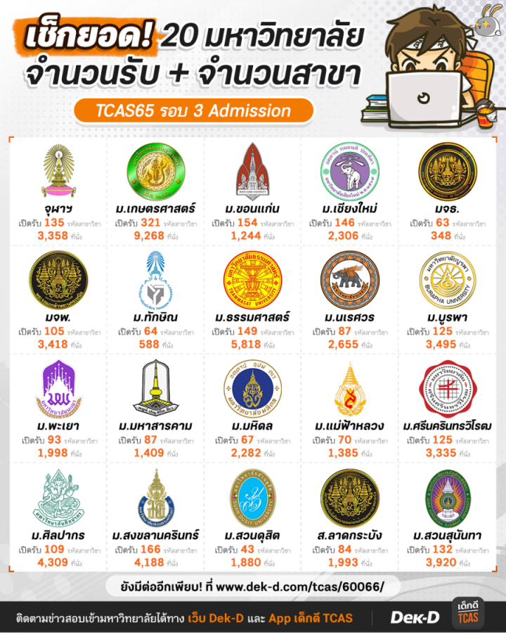 | 16 | ม.แม่ฟ้าหลวง | -รับทั้งหมด 1,385 ที่นั่ง -เปิดรับทั้งหมด 70 รหัสสาขาวิชา (รวมทุกรูปแบบ) -ม.แม่ฟ้าหลวง แบ่งการรับเป็น 3 แบบใหญ่ๆ คือ กลุ่มใช้วิชาสามัญ, กลุ่มใช้ GAT/PAT และกลุ่มที่ใช้ทั้งวิชาสามัญและ GAT/PAT | คลิก |
