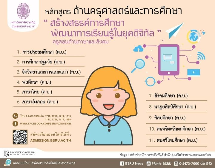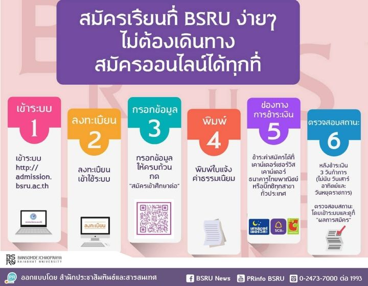- แฟนเพจ WWW.FACEBOOK.COM/BSRUADMISSION (เพจ งานรับสมัครนิสิต นักศึกษา สำนักส่งเสริมวิชาการและงานทะเบียน)