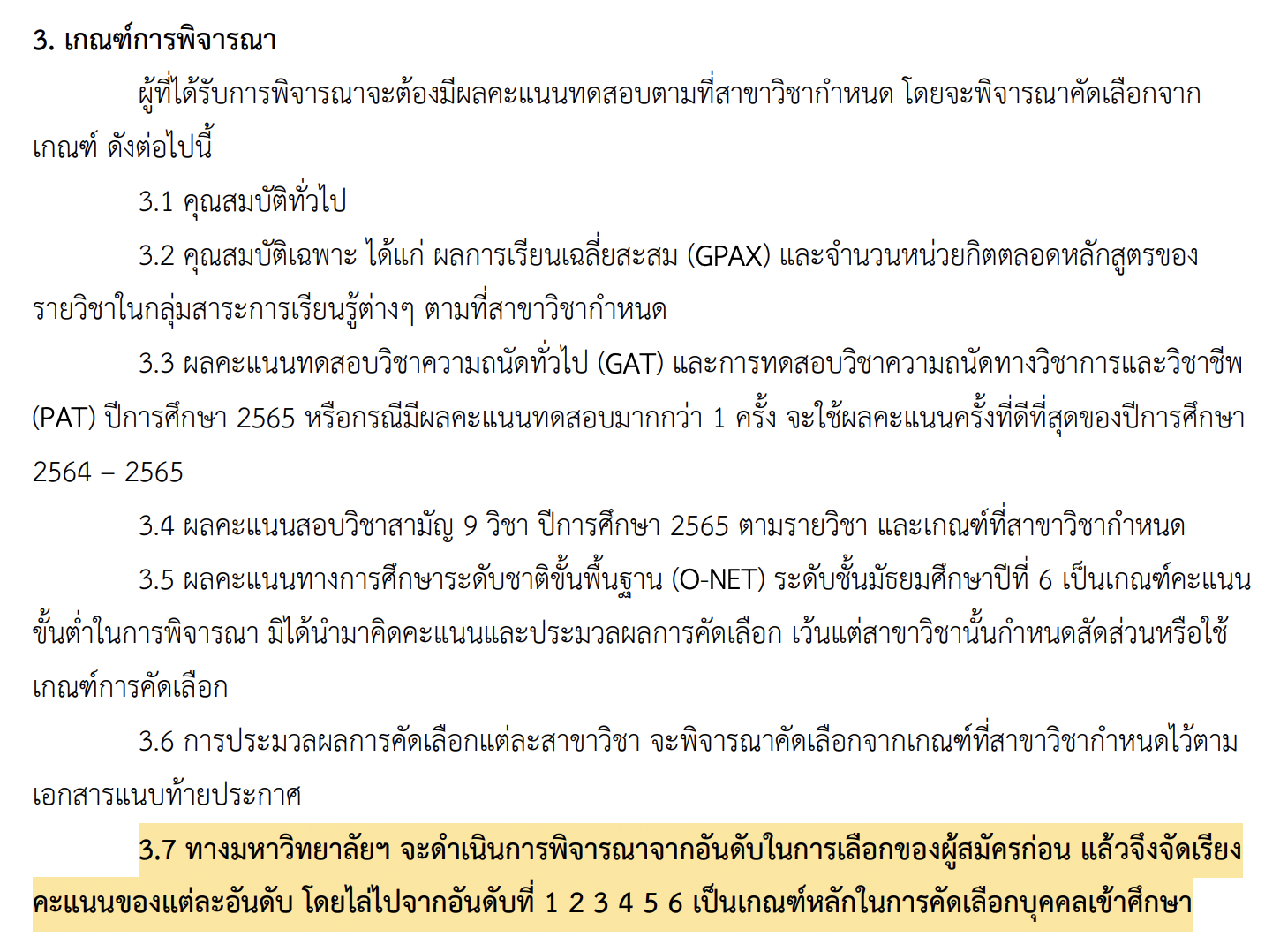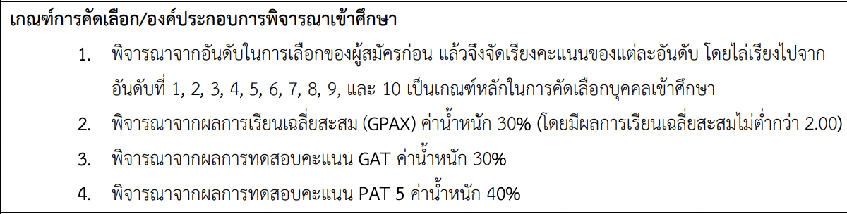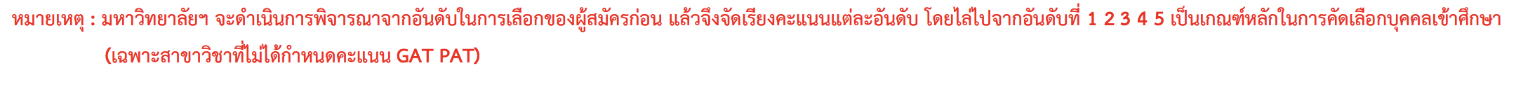 ท้ายตารางเกณฑ์การคัดเลือก มีหมายเหตุระบุไว้สำหรับสาขาวิชาที่ไม่ได้กำหนดใช้คะแนน GAT/PAT จะพิจาณาไล่การผู้ที่สมัครเป็นอันดับ 1, 2, 3, 4, 5 ตามลำดับ เช่น